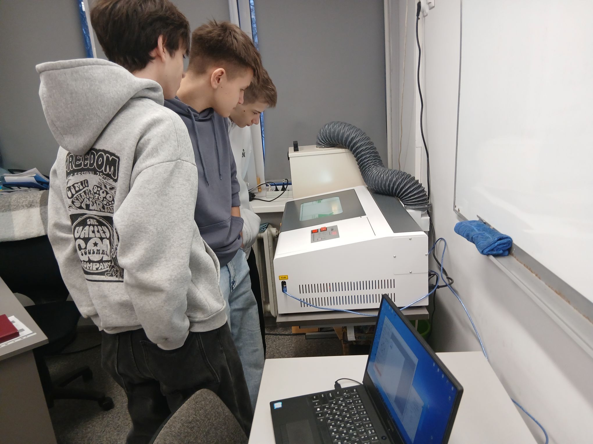 Обучающиеся 8-10 классов активно осваивают лазерный станок в школьном Центре «Точка роста». Ребята научились работать в векторном редакторе Inkscape и передавать трёхцветную модель на станок (черный цвет – гравировка или растровое рисование, синий – векторное рисование, красный – резка). Уже выполнены такие простые модели как: брелок, подставка, фоторамка. Теперь перед школьниками стоит задача – подготовить ряд настольных игр для ребят младшего школьного возраста, а также принять участие во всероссийском конкурсе изобретений «Шустрик». |